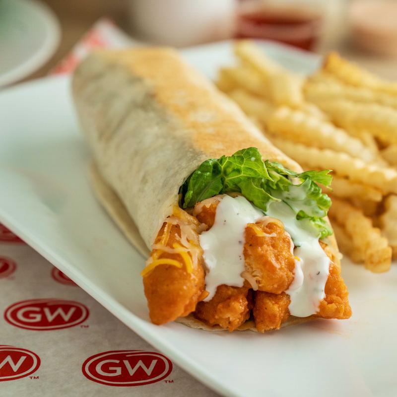 Crispy or grilled chicken in buffalo sauce, cheddar, lettuce, & ranch on a tortilla