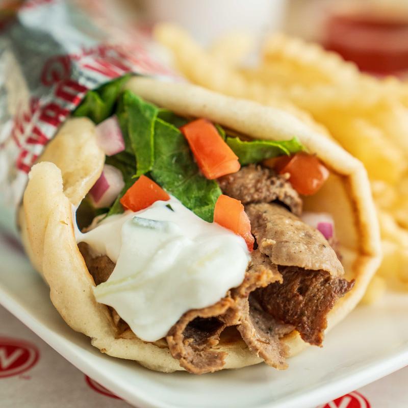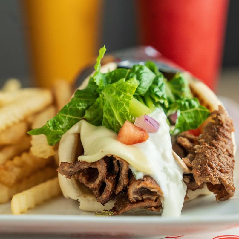 Seasoned gyro, red onion, lettuce, tomato, & tzatziki