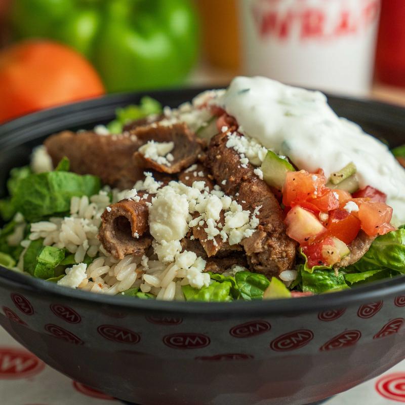 Seasoned gyro or falafel, feta, tomato & cucumber salad, & tzatziki over seasoned rice or lettuce