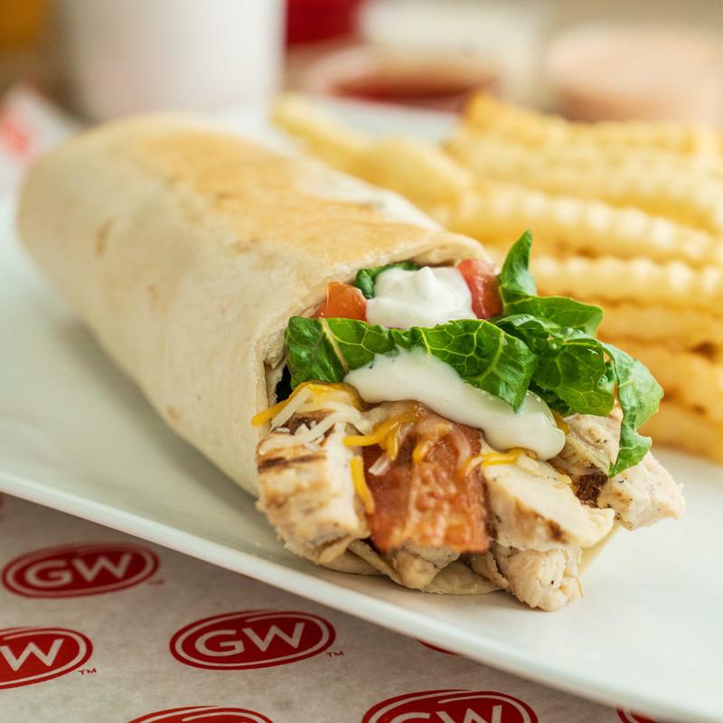 Grilled chicken, bacon, cheddar, lettuce, tomato, & creamy feta on a tortilla
